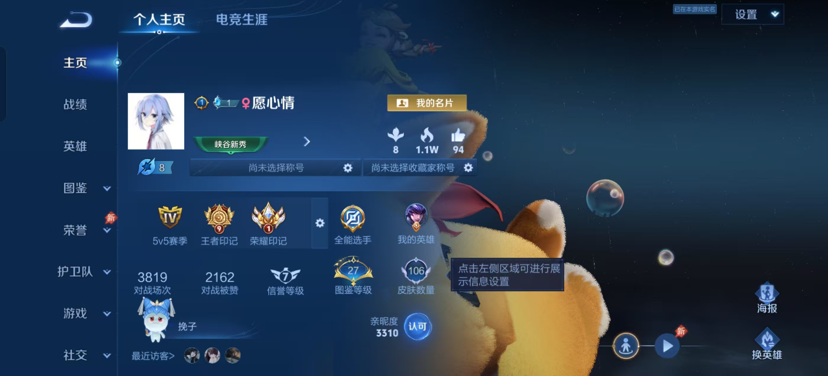 适配系统:安卓 角色名:QQ 信誉分:95 账号类型(腾讯):QQ 排位赛:允许 段位:至尊星耀 巅峰赛:不允许 英雄数量:124 皮肤数量:106 分销起租时长:2 VIP等级:4 禁言/不能加好友:否