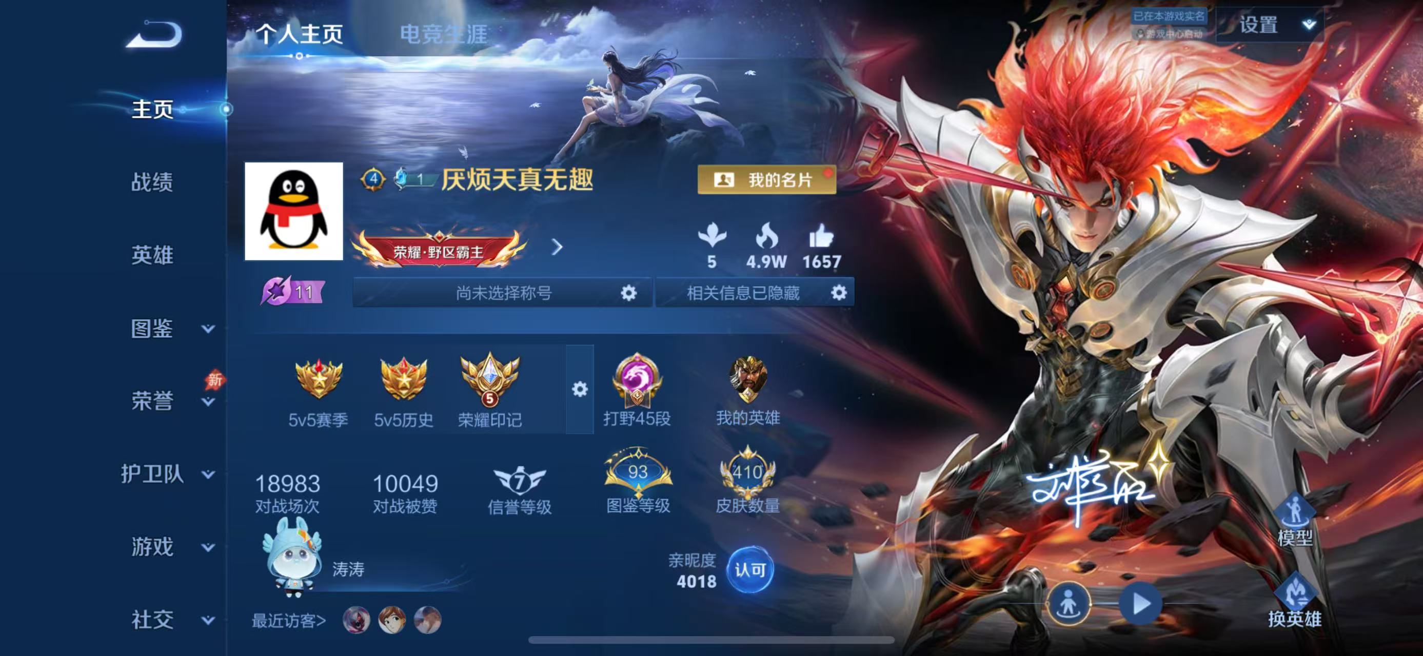 适配系统:苹果 角色名:1 信誉分:100 账号类型(腾讯):QQ 排位赛:允许 巅峰赛:允许 段位:至尊星耀 英雄数量:129 皮肤数量:410 营地ID:2135099211 分销起租时长:2 VIP等级:9 国标类型标识:2 禁言/不能加好友:0
