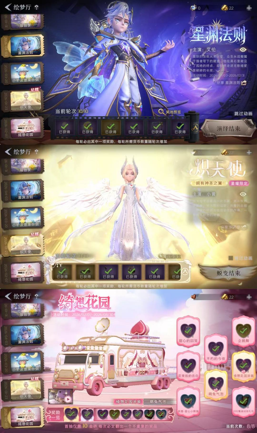 全美妆★满抽星渊法则★满抽炽天使小黄★满氪晶澜灵翼★小羊剑★满抽渡鸦公爵★满抽莲华渡★引泽山海蓝皮