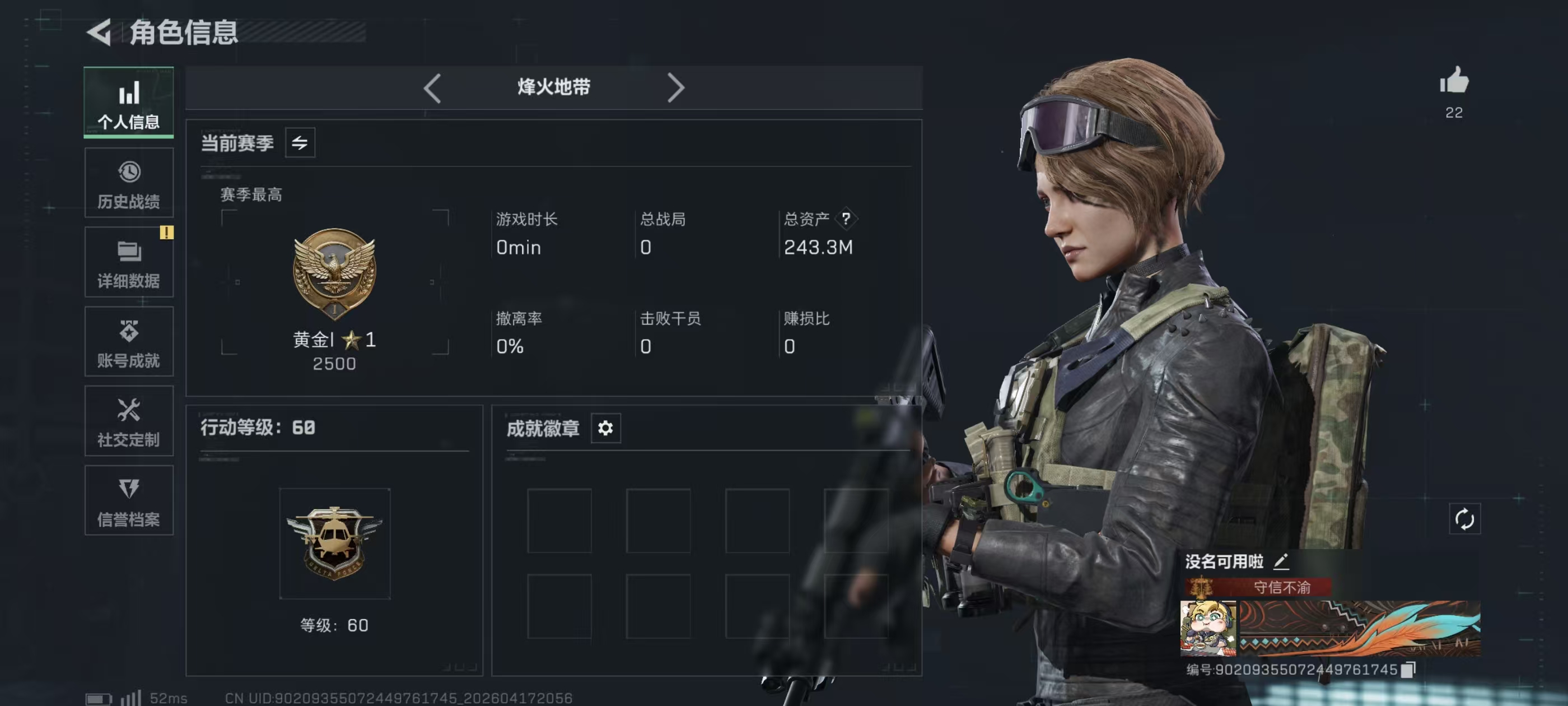 哈夫币比例:18 烽火地带等级:60 全面战场段位:上等兵 负重等级:6级 典藏皮肤数:1 哈夫币:215165950 AWM红弹数量:10 载具皮肤数:18 六套装备数量:10 角色名:没名可用啦 烽火地带段位:铂金 干员数:12 体力等级:满级 普通皮肤数:120