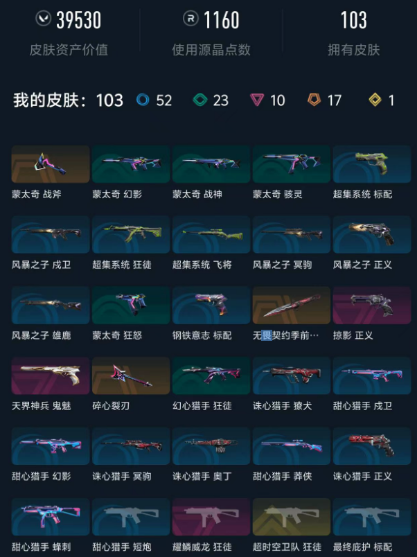 段位:超凡 终极数量:1 传奇数量:17 卓越数量:10 英雄数量:29 维权率限制:40 在线解冻结时间:0:00至24:00 到时不下线:否 分销折扣价:无折扣 分销起租时长:2 排位赛:可排位 出租次数限制:2 武器皮肤数量:103