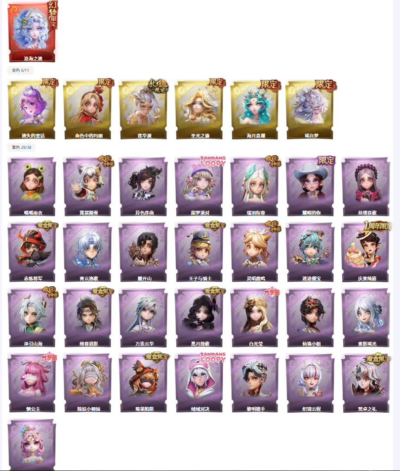 金色皮肤:6 紫色皮肤:29 是否有兔宝:是 道具皮肤:99