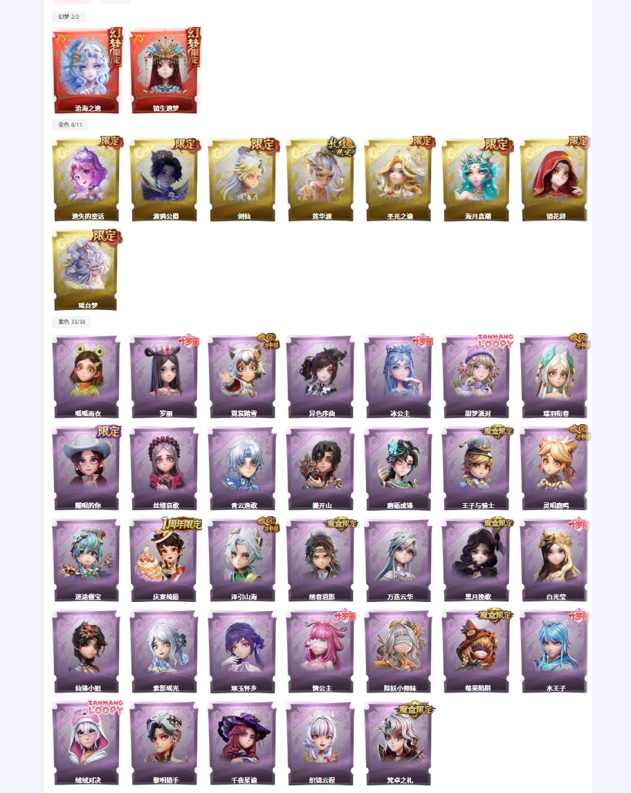 金色皮肤:8 紫色皮肤:33 是否有兔宝:是 道具皮肤:99